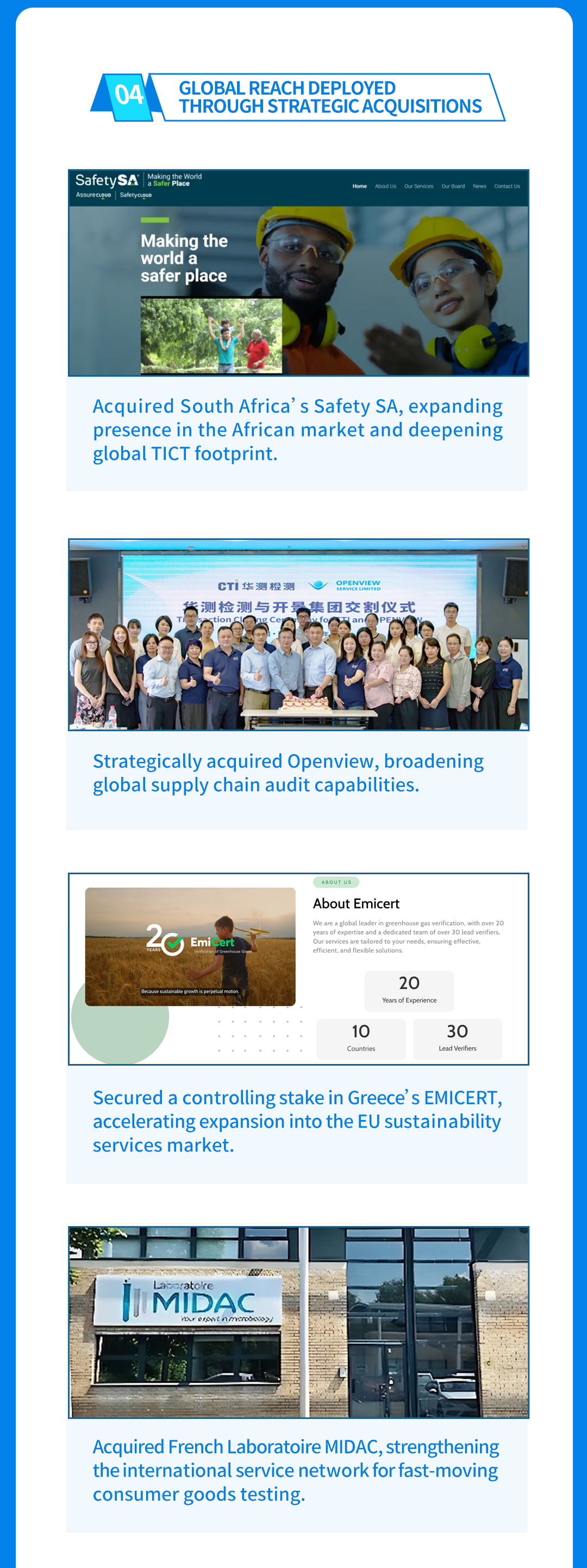 Centre Testing International Co., Ltd. (CTI) is the pioneer and leader in the TIC Industry which provides one-stop solutions on testing, inspection, certification, calibration, audit, training & technical services.