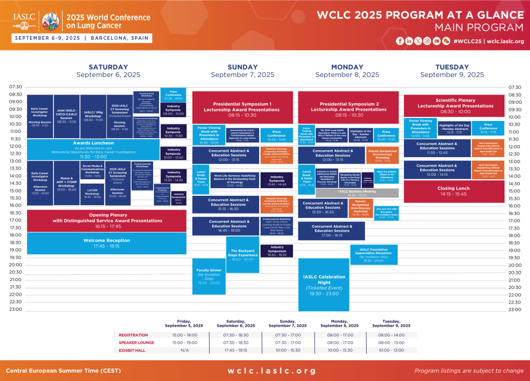 由国际肺癌研究协会(IASLC)举办的2025世界肺癌大会(WCLC)即将于今年9月6-9日在西班牙巴塞罗那召开。作为全球规模最大、最具影响力的肺癌领域国际学术会议,本届大会将吸引来自全球各国的肺癌专家、研究人员和医疗专业人士参与。大会整体日程如下: