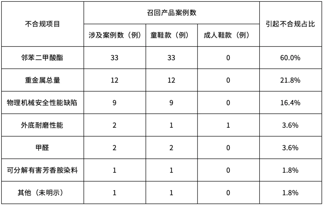 邻苯二甲酸酯含量超标、重金属总量超标以及物理机械安全性能缺陷,是童鞋产品召回的主要原因。